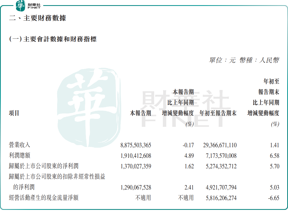 財報顯示,第三季度公司實現營收88.76億元(單位人民幣,下同),同比小幅下滑0.17%;歸母淨利潤為13.70億元,同比增長1.62%。該公司在收入端承壓的情況下,通過提效和結構升級實現了盈利的提升,不過仍遜於機構預期。