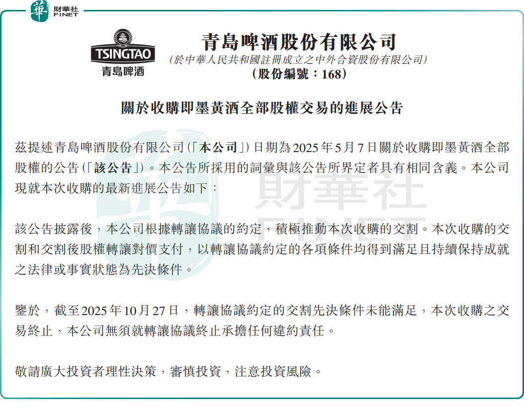 公告指出,因《股權轉讓協議》中約定的交割先決條件未能滿足,本次收購交易終止,且青島啤酒無需承擔違約責任。