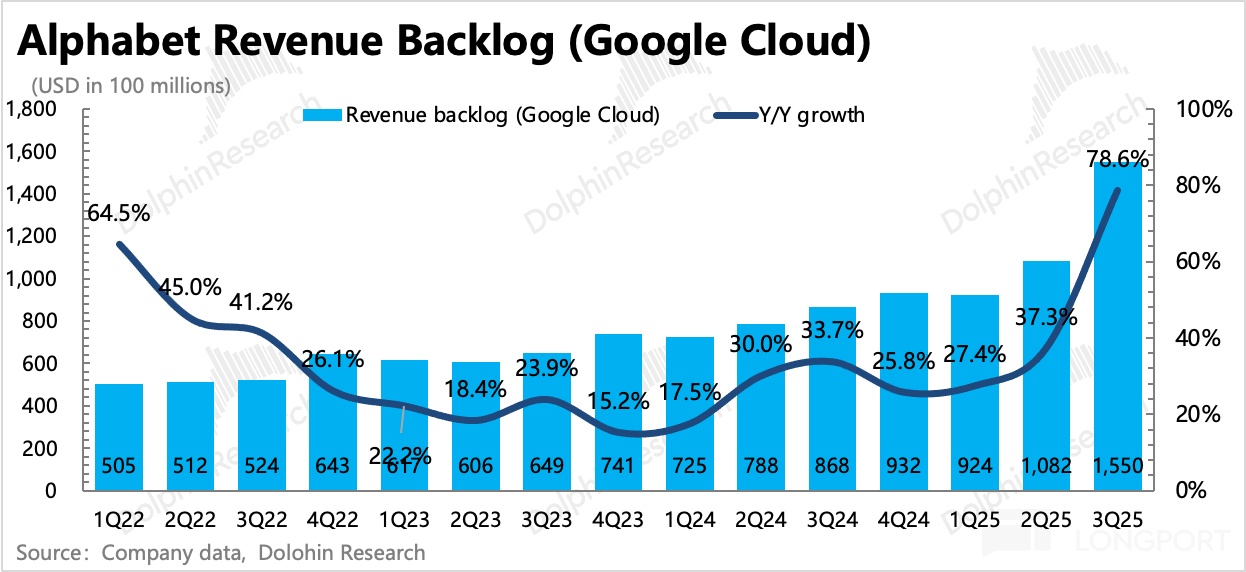 2. 谷歌雲景氣度持續:雲業務現在已經主要看積存的未履約訂單了(Revenue Backlog),只要訂單積累保持高增速,那麼未來一段時間的雲收入增長就能夠保持。截至 Q3 末,積存訂單達到 1550 億,同比增長 43%,環比淨增 470 億,不包含最近剛爆出的 Anthropic 的 200 億訂單。有了這些訂單存貨,收入增速可以在一段時間繼續保持在 30% 以上。