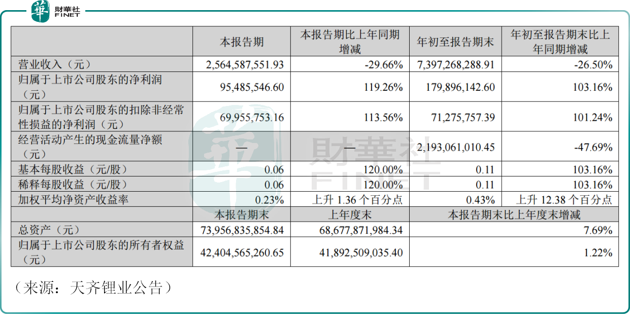 數據顯示,天齊鋰業第三季度營收為25.65億元,同比下降29.66%;歸母淨利潤為9548.55萬元,同比扭虧為盈。