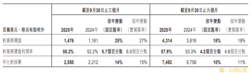 【財華社訊】友邦保險(01299.HK)早間盤中一度漲超4%,截至發稿,漲3.14%,報75.5港元。消息面上,該公司公佈,截至2025年9月30日止第三季,新業務價值上升25%至14.76億美元,新業務價值利潤率則受產品組合的有利轉變所帶動,上升5.7個百分點至58.2%。按新業務保費現值基準呈報的利潤率由10%增至11%,而總加權保費收入增加14%至119.10億美元。