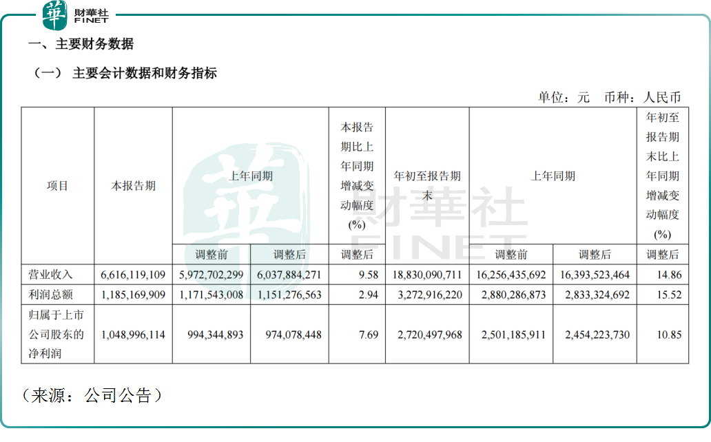 其中,公司第三季度實現營業收入66.16億元,同比增長9.58%;實現歸母淨利潤10.49億元,同比增長7.69%。相較於一、二季度營收及淨利潤雙位數增長表現,三季度增速明顯放緩。