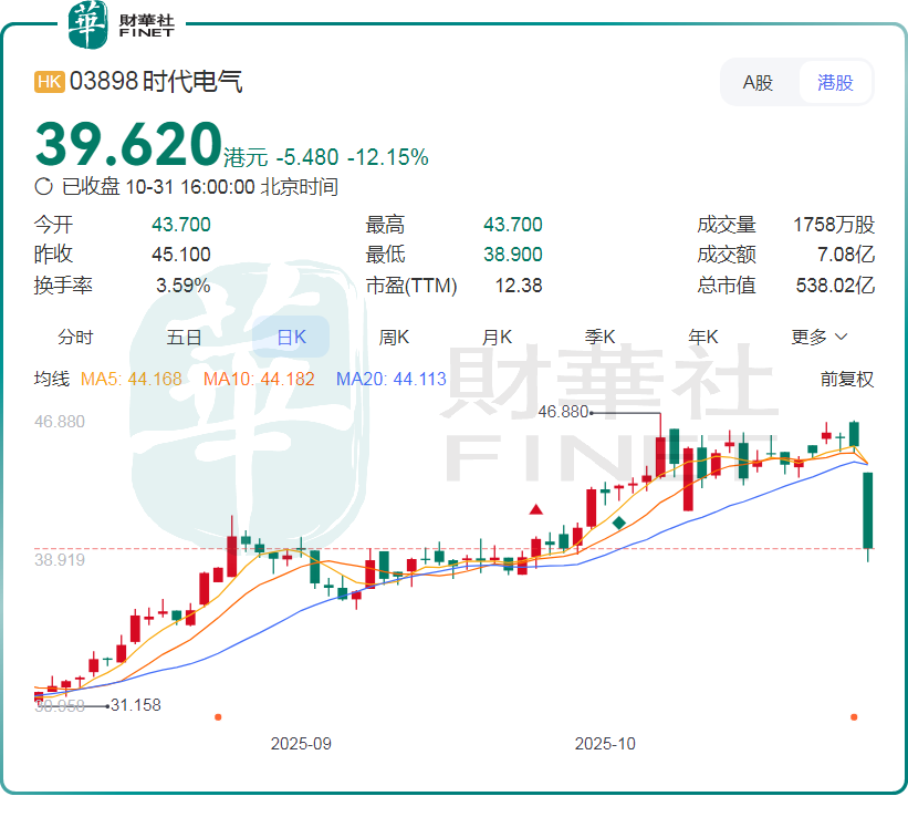 10月31日,A股的時代電氣(688187.SH)放量大跌6.99%,港股的時代電氣(03898.HK)更是跳空大跌12.15%,引發市場嘩然。