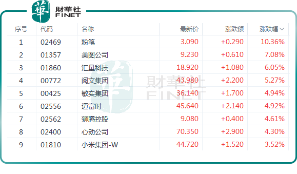 在港股市場,截至收盤,粉筆(02469.HK)大漲10.36%,美圖公司(01357.HK)也上漲7.08%,匯量科技(01860.HK)漲6.05%,閱文集團(00772.HK)漲5.27%,邁富時(02556.HK)漲4.92%,心動公司(02400.HK)漲4.3%。