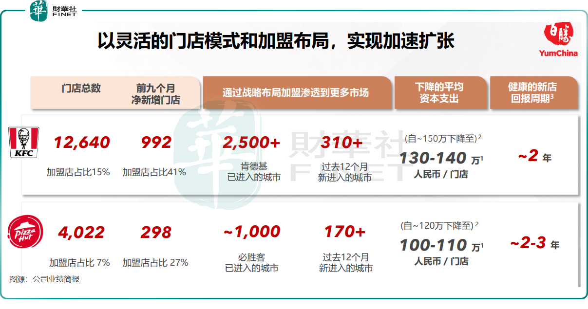 下沉市場是擴張的重點,肯德基和必勝客分别進入了2500+和約1000座城市。得益於加盟店比例提升和門店模型優化,兩大品牌的開店平均資本支出有所下降,新店回報週期保持健康,這成為百勝中國在競爭激烈的市場中保持利潤穩健增長的關鍵因素之一。