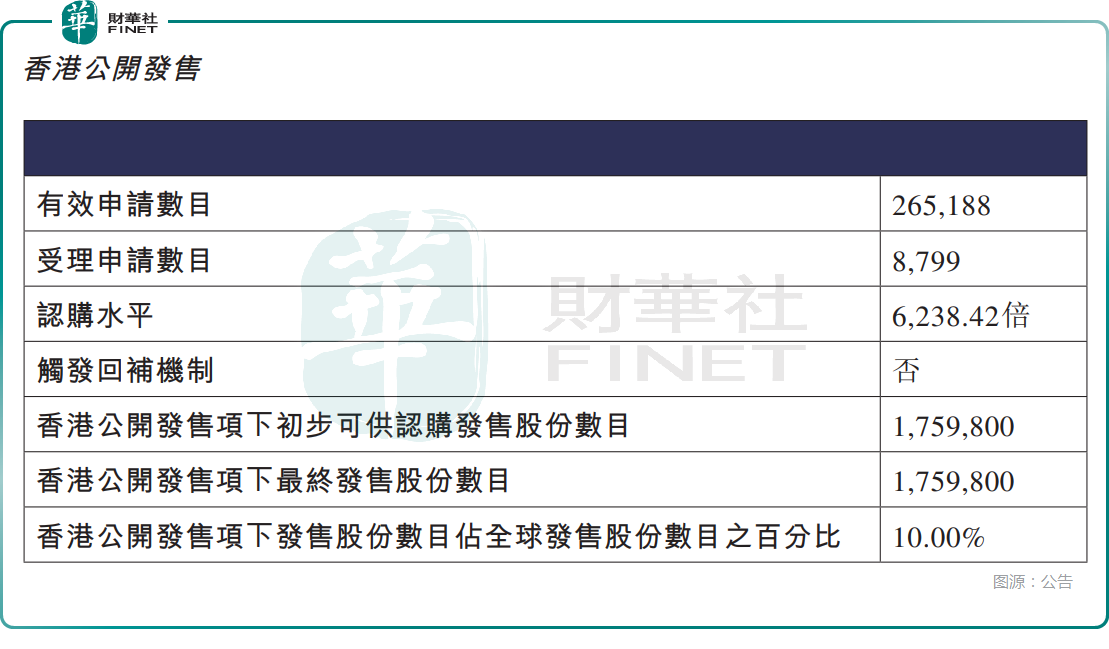 根據公告,香港公開發售方面,旺山旺水獲6238.42倍認購,香港公開發售的發售股份最終數目為175.98萬股股份,佔發售股份總數的約10%。合共接獲約26.5萬份有效申請,受理申請數目8799份。