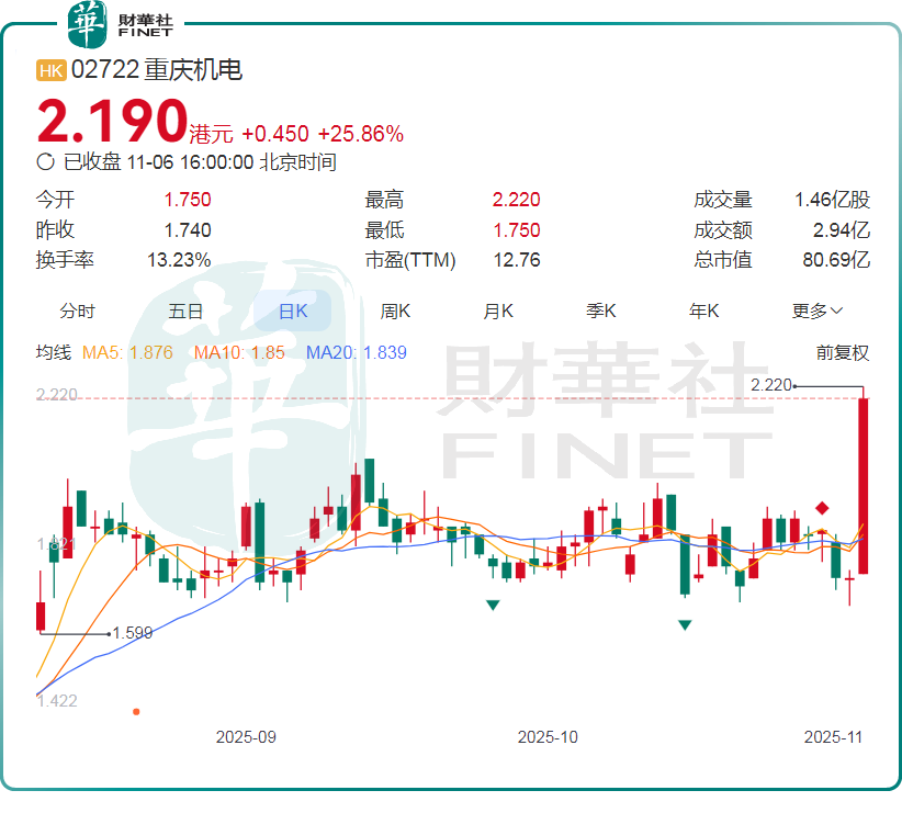在此背景下,港股市場的重慶機電(02722.HK)今日表現引人注目。11月6日,該公司放量大漲25.86%,創十餘年新高,目前報2.19港元/股,市值達80.69億港元。