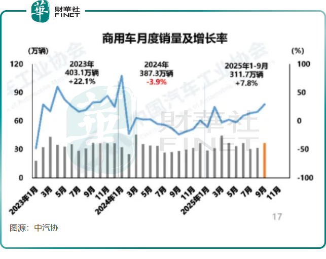 據中國汽車工業協會統計,2025年前三季度我國商用車銷量達311.7萬輛,同比增長7.8%。其中9月銷量同比增長29.6%,自7月以來增速明顯加快。