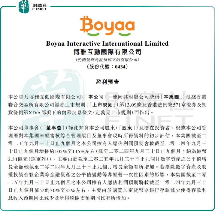 財報顯示,今年前三季度,博雅互動歸母淨利潤預期同比增長約105%至115%左右(2024年同期約為港幣2.34億元(經重列),這主要由於2025年前9個月數字資產的公平值增長金額較2024年同期有所增加。