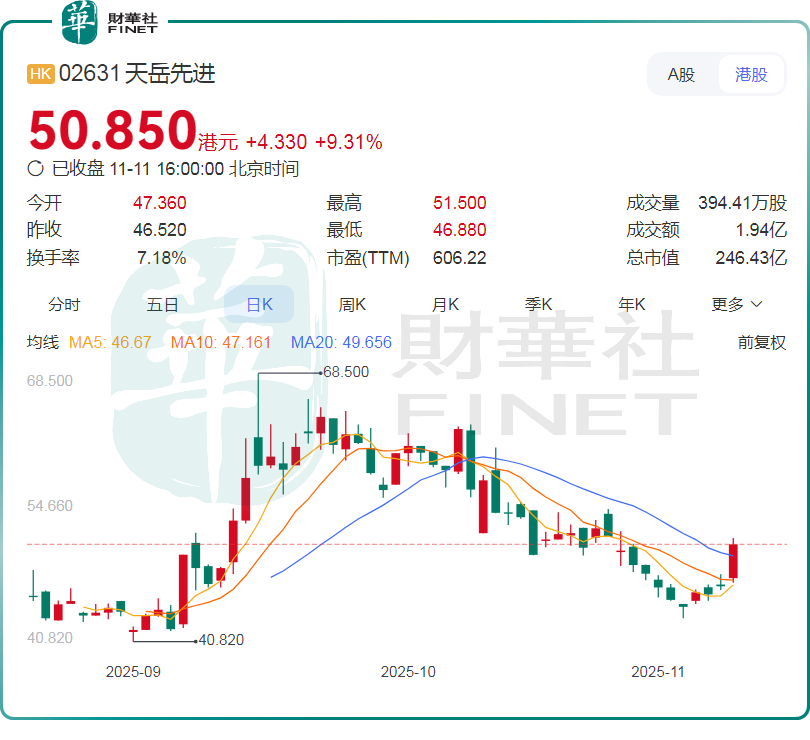 11月11日,號稱「碳化矽第一股」的天嶽先進(688234.SH)大漲6.21%,剛登陸港股不久的天嶽先進(02631.HK)今日亦大漲9.31%。