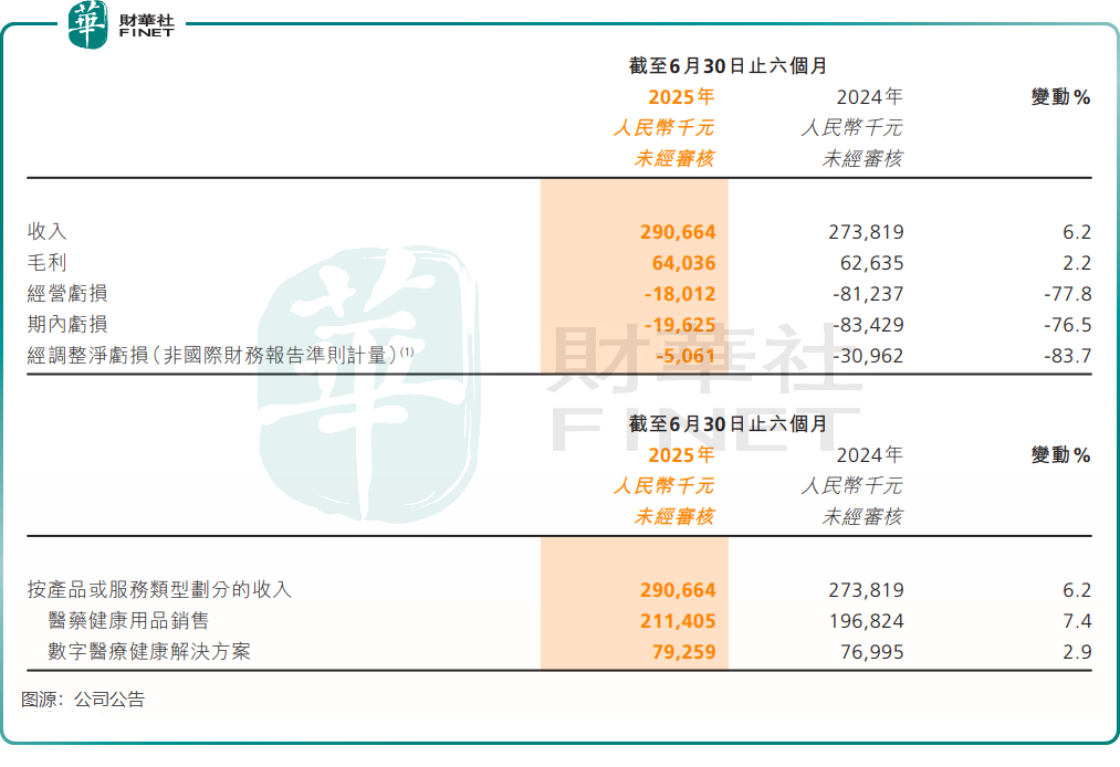 今年上半年,健康160實現收入2.91億元(單位人民幣,下同),同比增長6.2%。其中,醫療健康用品銷售和數字醫療健康解決方案業務收入分别同比增長7.4%及2.9%。報告期内,公司有效控製成本,多元服務之間的協同效應亦降低了獲客成本,使得虧損同比大幅收窄76.5%,至1962.5萬元,距離實現盈利更近一步。