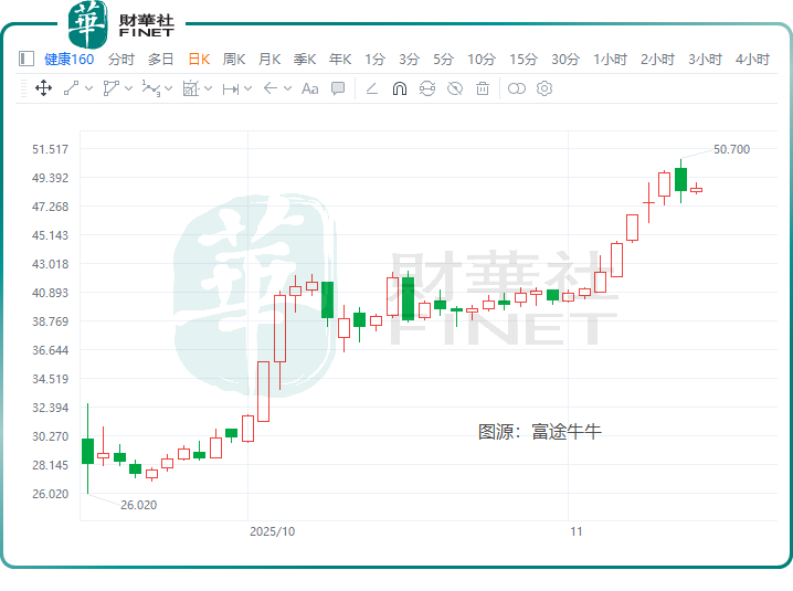 健康160(02656.HK)即為近期最受矚目的次新股之一。健康160是富有經驗的中國醫藥健康用品批發商及領先的數字醫療綜合服務提供商,公司於今年9月17日以每股11.89港元發行上市,掛牌初期股價有所震蕩,隨後持續走強,截至目前累計漲幅已超過300%,交投十分活躍,市場關注度持續攀升。