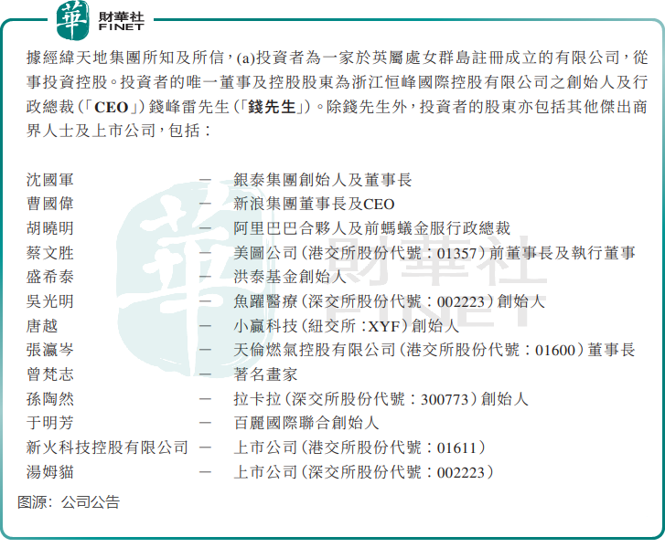 除了錢峰雷外,恒峰國際的股東還包括新浪集團董事長曹國偉、被譽為「資本獵手」的銀泰集團創始人沈國軍、阿里巴巴合夥人胡曉明、美圖公司(01357.HK)前董事長蔡文勝、魚躍醫療(002223.SZ)創始人吳光明、天倫燃氣(01600.HK)董事長張瀛岑等人。強大的股東背景,為經緯天地注入了極高的市場信心。