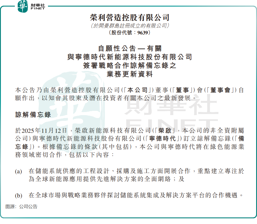 與「寧王」達成合作,標誌著榮利營造正式切入新能源及儲能賽道,實現從傳統建築承建商向綠色科技服務商的戰略轉型。寧德時代提供的技術與品牌背書,將有力增強市場對公司的信心。