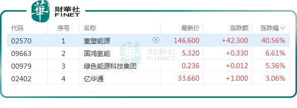 在港股陣營,截至收盤,重塑能源(02570.HK)表現最為突出,漲幅達40.56%;國富氫能(02582.HK)漲6.7%,國鴻氫能(09663.HK)漲6.61%,億華通(02402.HK)漲3.06%,中集安瑞科(03899.HK)、京城機電股份(00187.HK)等氫能源概念股跟漲。