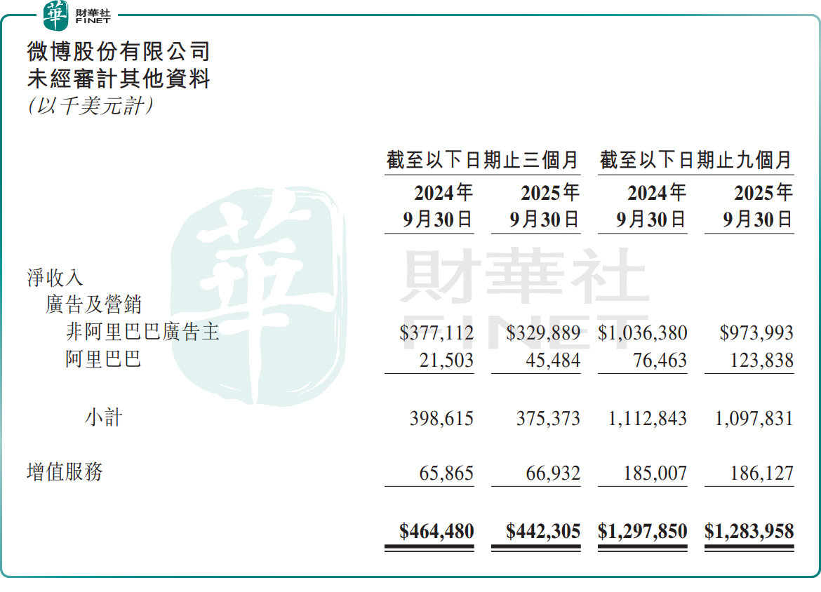 財報顯示,2025年前三季度,微博收入約12.84億美元,同比下滑1.07%;歸母淨利潤約4.54億美元,同比增長55.43%。