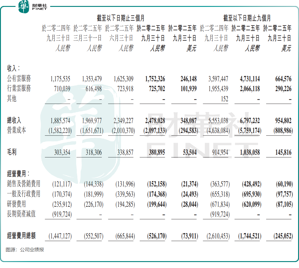 報告期内,公有雲服務收入同比大幅增長49.1%,達17.52億元。其中,AI相關業務賬單收入達到7.82億元,同比激增約120%。