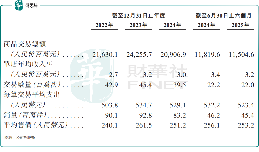 更直觀的是經營端的疲軟,自2024年以來,公司的GMV(商品交易總額)、交易數量、銷量及單店年均收入均同步下滑,曾經「門店排長隊」的盛況不再。就連不少加盟商也選擇黯然退場,僅2025年上半年就有195家加盟店閉店,當期淨減少131家加盟店。