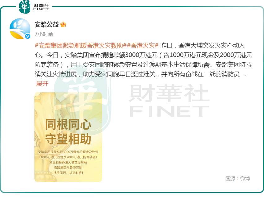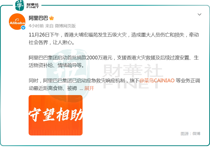 其中,阿里巴巴(09988.HK)方面也宣佈,集團啓動首批捐款2000萬港元,支援香港火災救援及後續過渡安置、生活物資補給、情緒疏導等。