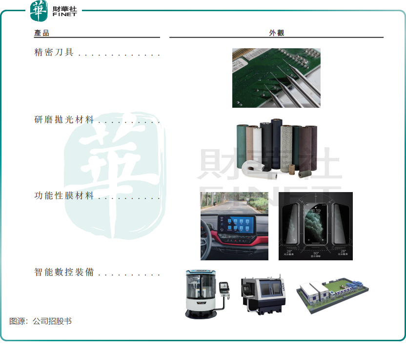 公司實現了「工具+材料+裝備」全產品線佈局,產品組合涵蓋四大類,包括精密刀具、研磨抛光材料、功能性膜材料、智能數控裝備。這些產品服務於AI服務器、具身機器人、半導體及集成電路相關應用、低軌衛星通信、高端裝備製造及智能汽車,以及消費電子、通訊及工業控製等行業。