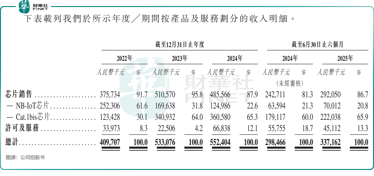 從業務結構來看,公司收入主要來自芯片銷售(NB-IoT和Cat.1bis)及許可及服務兩大板塊。