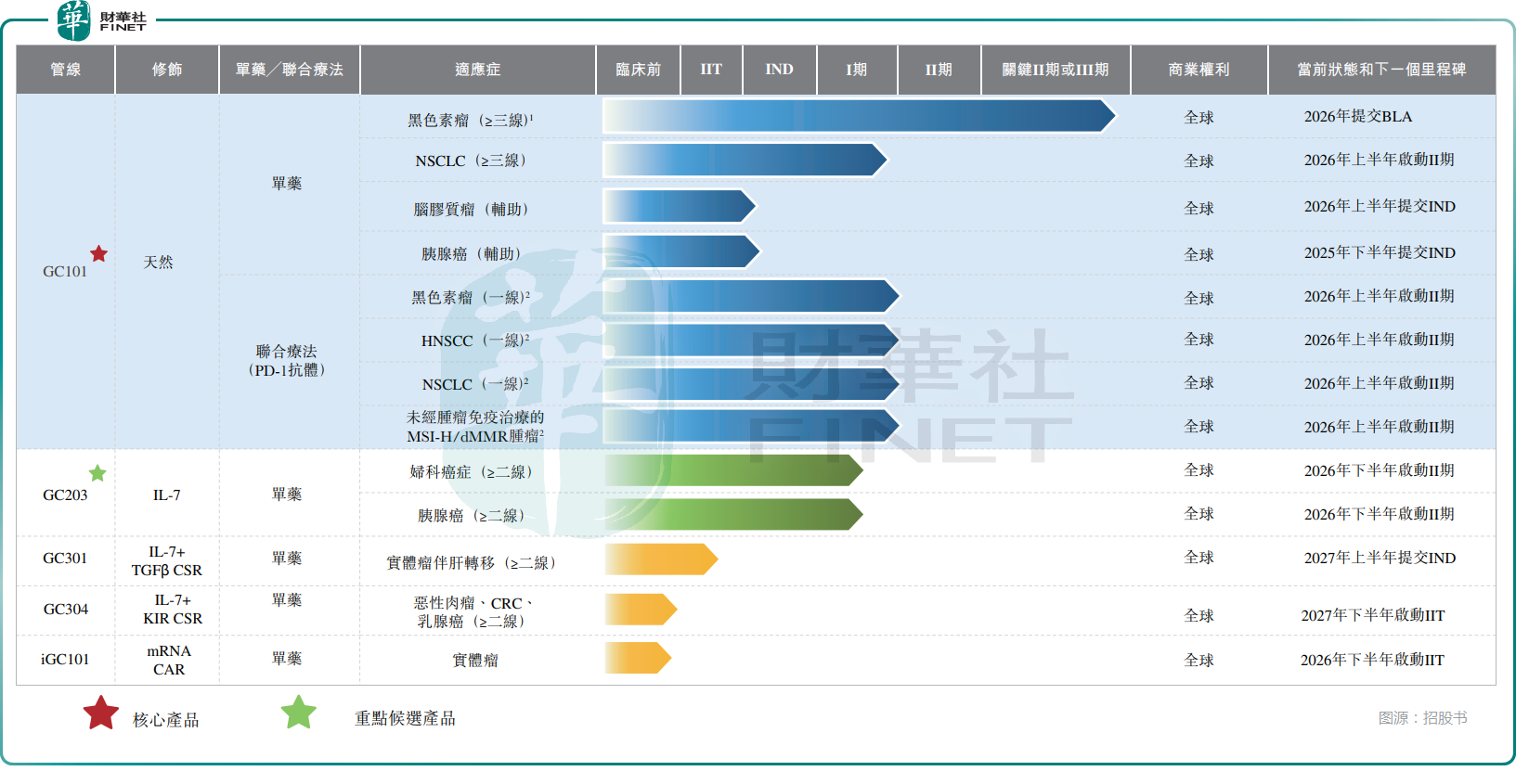 目前,GC101用於治療黑色素瘤的臨床試驗正在開展關鍵II期臨床試驗,預計將於2026年提交生物製品許可申請(BLA);GC101用於治療非小細胞肺癌的臨床管線目前處於Ib期臨床;多適應症的早線聯合治療和術後輔助治療也已佈局,如下圖所示。