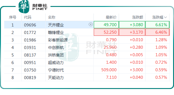 港股方面,鋰礦雙雄漲勢最猛,截至發稿前,天齊鋰業(09696.HK)大漲6.61%,贛鋒鋰業(01772.HK)漲6.46%,中創新航(03931.HK)漲1.09%,寧德時代(03750.HK)、天能動力(00819.HK)等均漲。