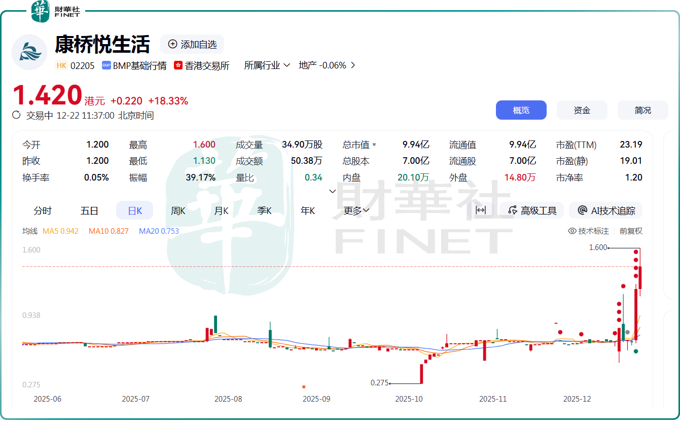 12月22日,康橋悅生活(02205.HK)股價延續強勢表現。