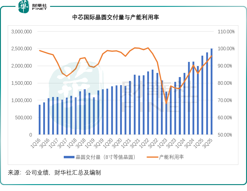 從數據來看,中芯國際(688981.SH)2025年第3季的業績表現強勁:產能利用率高達95.8%,出貨量環比增長4.6%,至249.95萬片折合8寸標準邏輯晶圓,平均售價(ASP)也因產品結構優化而上漲3.8%。