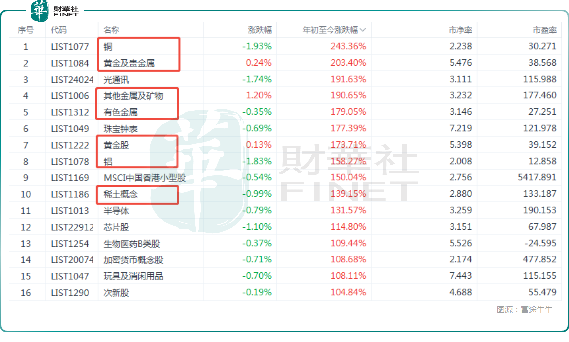 而在港股,銅板塊年內累漲逾243.33%,位居市場第一,黃金及貴金屬、其他金屬及礦物、有色金屬、黃金股、鋁、稀土都漲逾130%,都位列板塊漲幅前十。