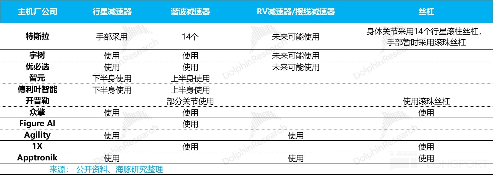 目前國內主機廠選絲槓路線的相對較少,仍然主要使用旋轉關節,這主要基於控制難度等原因。但考慮到絲槓優勢,長週期有采用趨勢,而特斯拉身體關節當前採用行星滾柱絲槓,靈巧手採用滾珠絲槓,但不排除未來更換技術路線,另有部分國內企業身體關節也暫時採用滾珠絲槓。