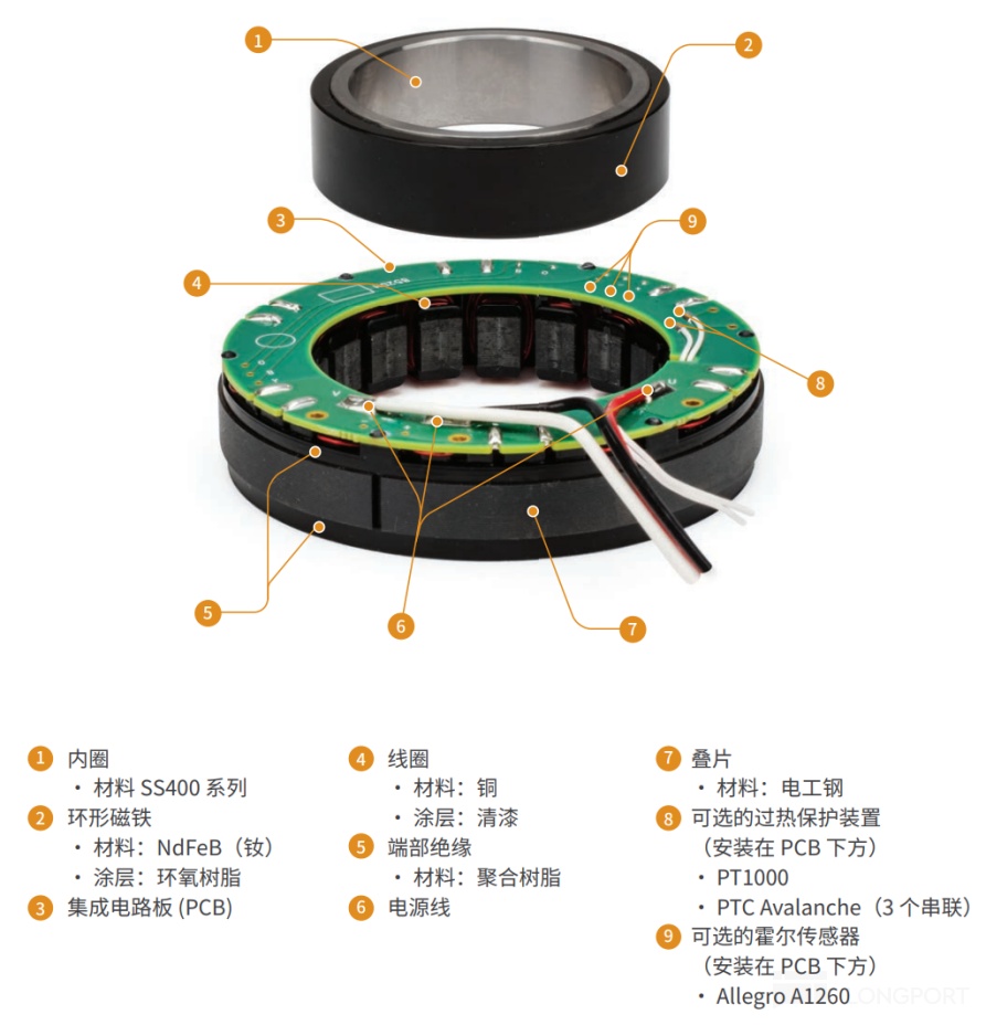 其中,轉子由環形磁鐵和鋼圈組成,可以直接跟關節的主軸集成在一起,定子由疊片和銅線圈等部件組成,可以直接與機器的外殼結合在一起。