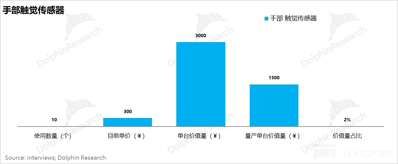 目前價值量佔比可能不高,但未來有增加可能性。根據我們的測算,Optimus手部需要使用10個及以上的觸覺傳感器,對應目前單臺人形機器人價值量在3000元,產業成熟後降本到1500元,在整個人形機器人價值量中佔比僅2%,但這裏需要注意的是,目前觸覺傳感器技術路線還未收斂,考慮到未來可能由電容式替代目前壓阻式,且未來還需要滿足陣列化以及多模態感知等需求,觸覺傳感器的價值量有進一步提升的可能性。