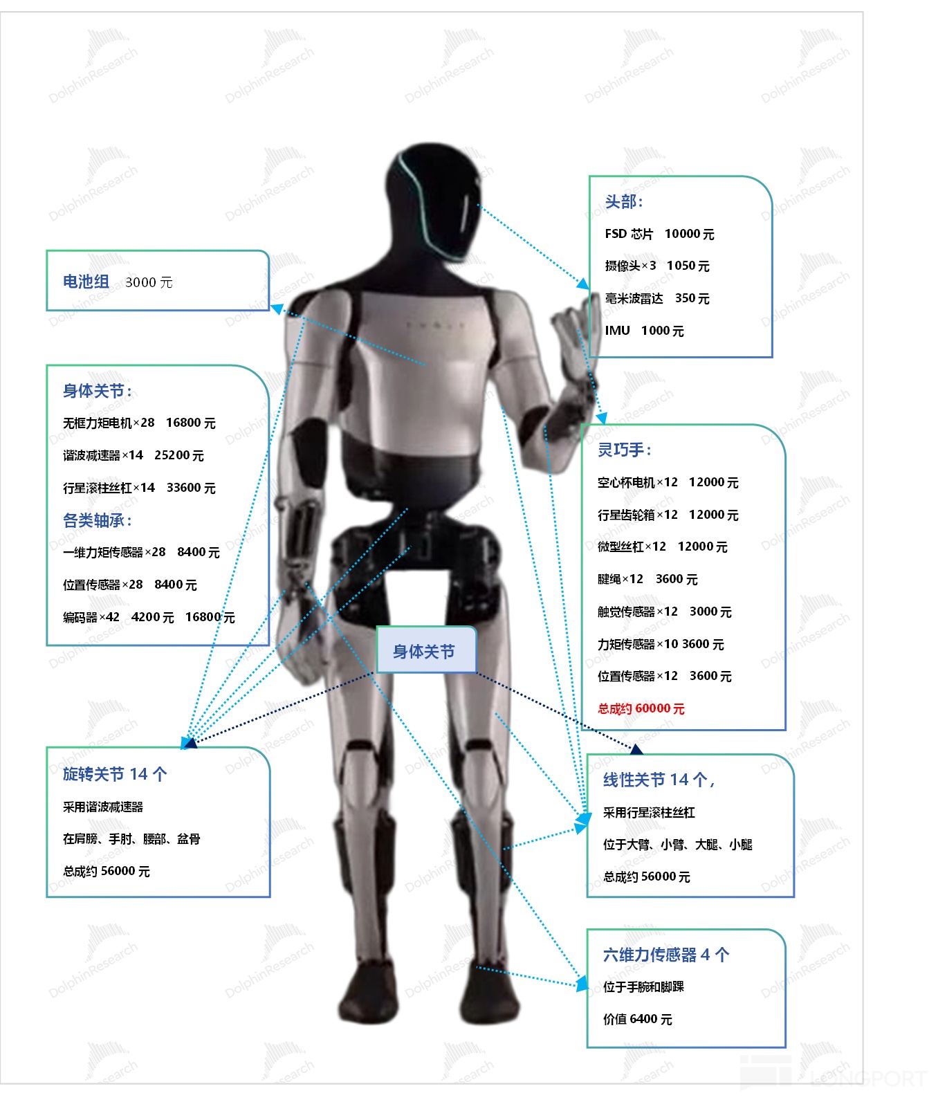 如果最終特斯拉能攻克下來,機器人的空間很顯然是比較大的。因此海豚君也進入本篇最爲核心的上游硬件的價值鏈拆解。這裏就以Optimus人形機器人爲例。
