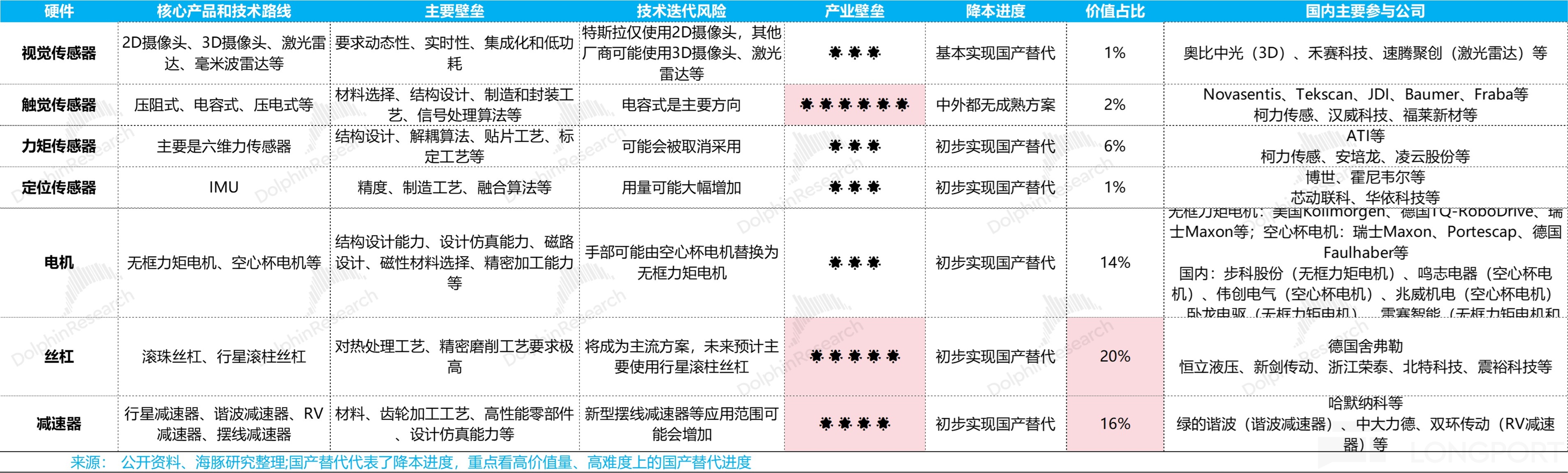 基於此,海豚君啓動了對機器人產業鏈的研究。本篇爲第一篇,更多是從產業和基礎研究視角,從上游開始,分析人形機器人在零部件生產和降本上的難度和機會,重點集中在以下幾個問題: