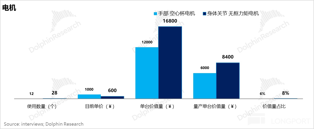 價值量有多少?根據我們的測算,Optimus需要使用多達40個電機,對應目前單臺人形機器人價值量在28800元,產業成熟後降本到14400元,在人形機器人當中佔比達到14%,成本佔比明顯高於上述傳感器。