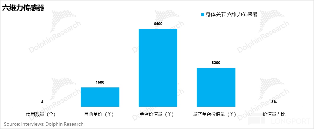 價值量佔比不高。根據我們的測算,Optimus需要使用4個六維力傳感器,對應目前單臺人形機器人價值量在5400元,產業成熟後降本到3200元,在人形機器人當中佔比在3%。