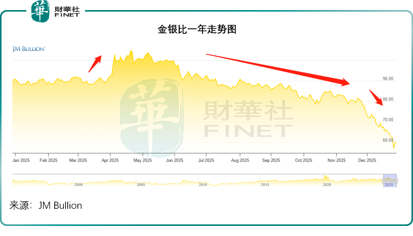 行情數據印證了這一判斷:白銀現貨價從10月1日的47.32美元/盎司飙升至當前的75.63美元/盎司,漲幅高達59.83%;同期金價則由3,865.74美元/盎司上漲至4,387.06美元/盎司,漲幅僅為13.49%,顯著低於銀價。伴隨價格走勢的分化,金銀比也從10月初的81.51快速回落至年末的58.44水平,見下圖。