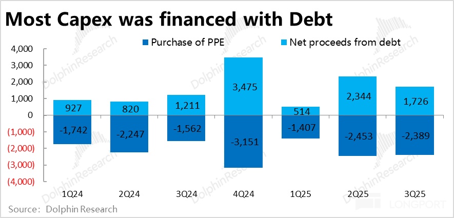 資產折舊攤折 6 年下,成本率還有 75%,可想而知公司的資本開支對收入的消耗有多大。這種情況下,公司的資本開支基本要靠舉債。當下,每個季度,公司基本都是把全收到的收入,再倒貼一倍的收入,投入到資本開支當中。