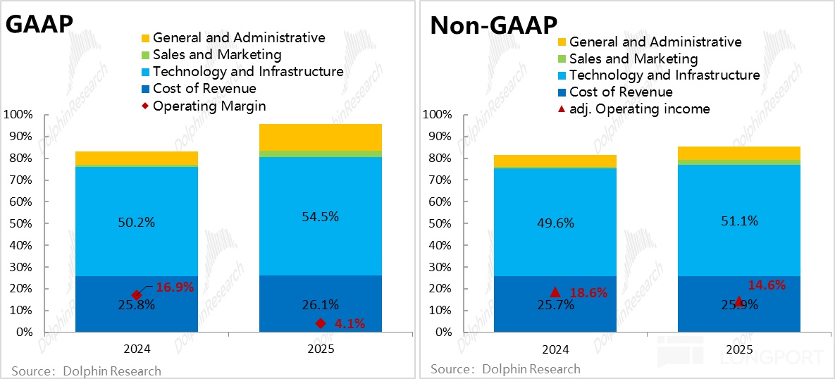 公司把創收成本定義爲數據中心建築和能源相關成本科技&基建費用(T&I)主要是各類軟硬件設備產生的折舊成本,還包括傳統研發、軟件訂閱費等費用。