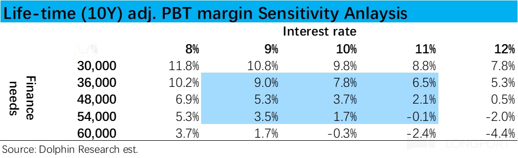同樣,基於不同的負債融資比例(按$60,000 的總 Capex,負債融資比例從 50%~100%),和不同的利息率,敏感性分析下 10 年生命週期內總稅前利潤率區間爲 0%~9% 之間。