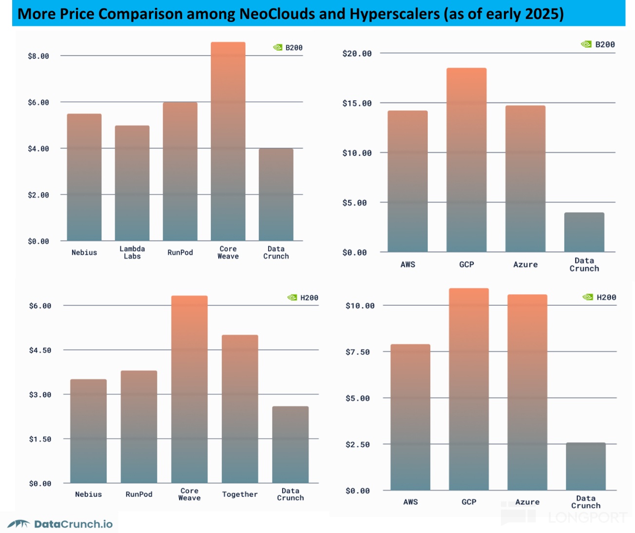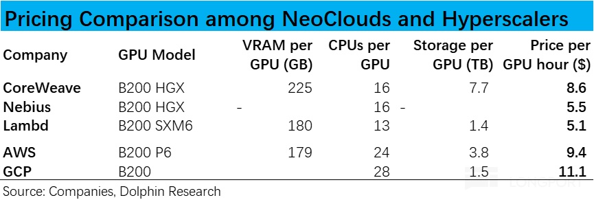 a. 定價:首先,影響盈利能力的第一要素就是對產品的不同定價能力。對類似的單個 B200 GPU 的定價,可以看到雲巨頭的定價($9 ~ $11/h)普遍高於新雲($5 ~ $8/h)。在運營成本類似的情況下,新雲的利潤率就是會低於巨頭們。