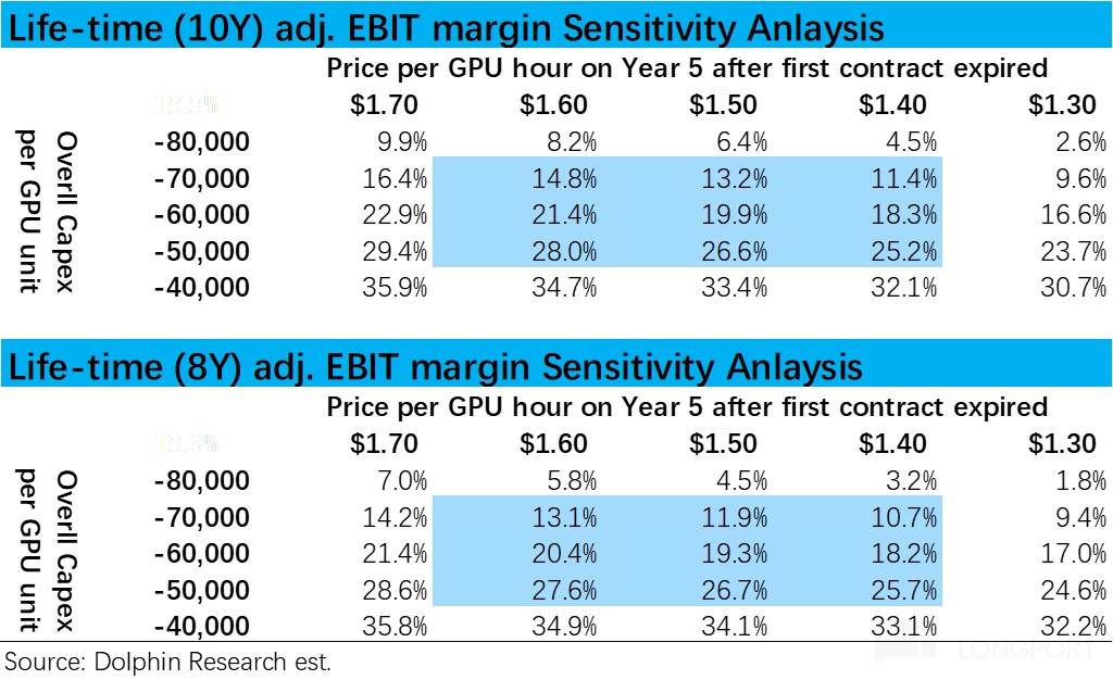 這作爲後續估值時,判斷公司長期穩態利潤率的基準。根據不同的合同到期後算力定價,和前置 Capex 投入多少,公司 adj.EBIT 利潤率的敏感性區間在 10%~28% 左右。
