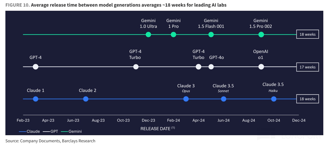 同時,從 2023 年初~2024 年底,ChatGPT、Gemini 和 Claude 這三個頭部模型平均每 18 周(即 4~5 個月)就會進行一次較大迭代。模型快速迭代,不僅是更高算力,也是對數據中心的硬件或軟件架構的要求更新。