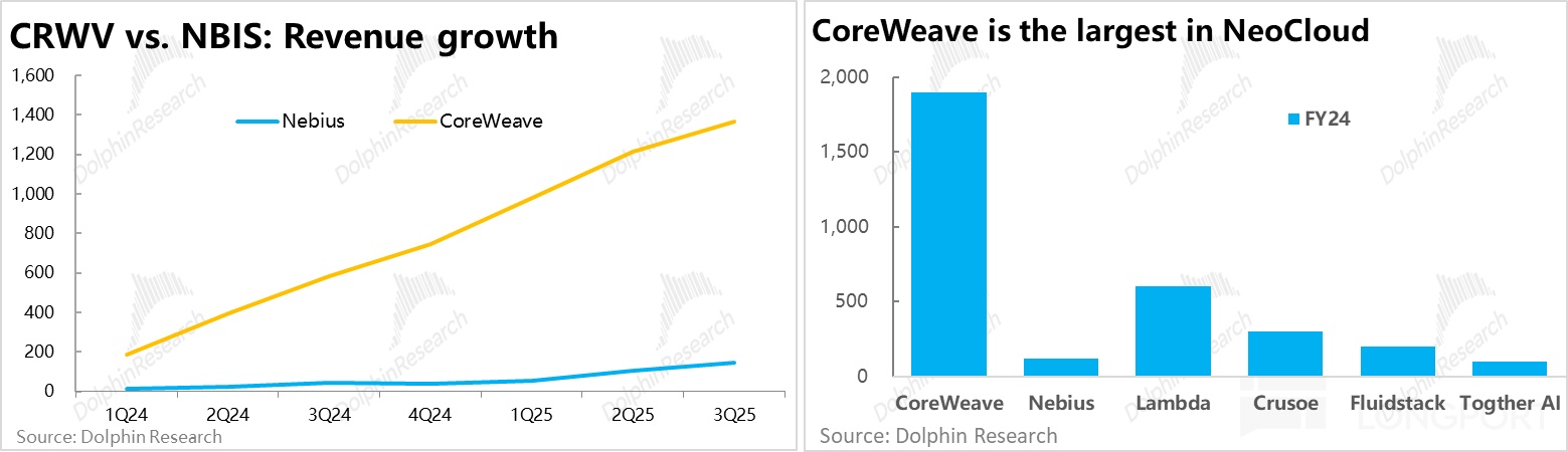 下圖可見,截至 24 年營收近$20 億的 CoreWeave 斷崖領先於同行普遍僅數億的營收規模。在 25 年前三季度,CoreWeave 的體量也仍相當於 Nebius 的 9~10x。