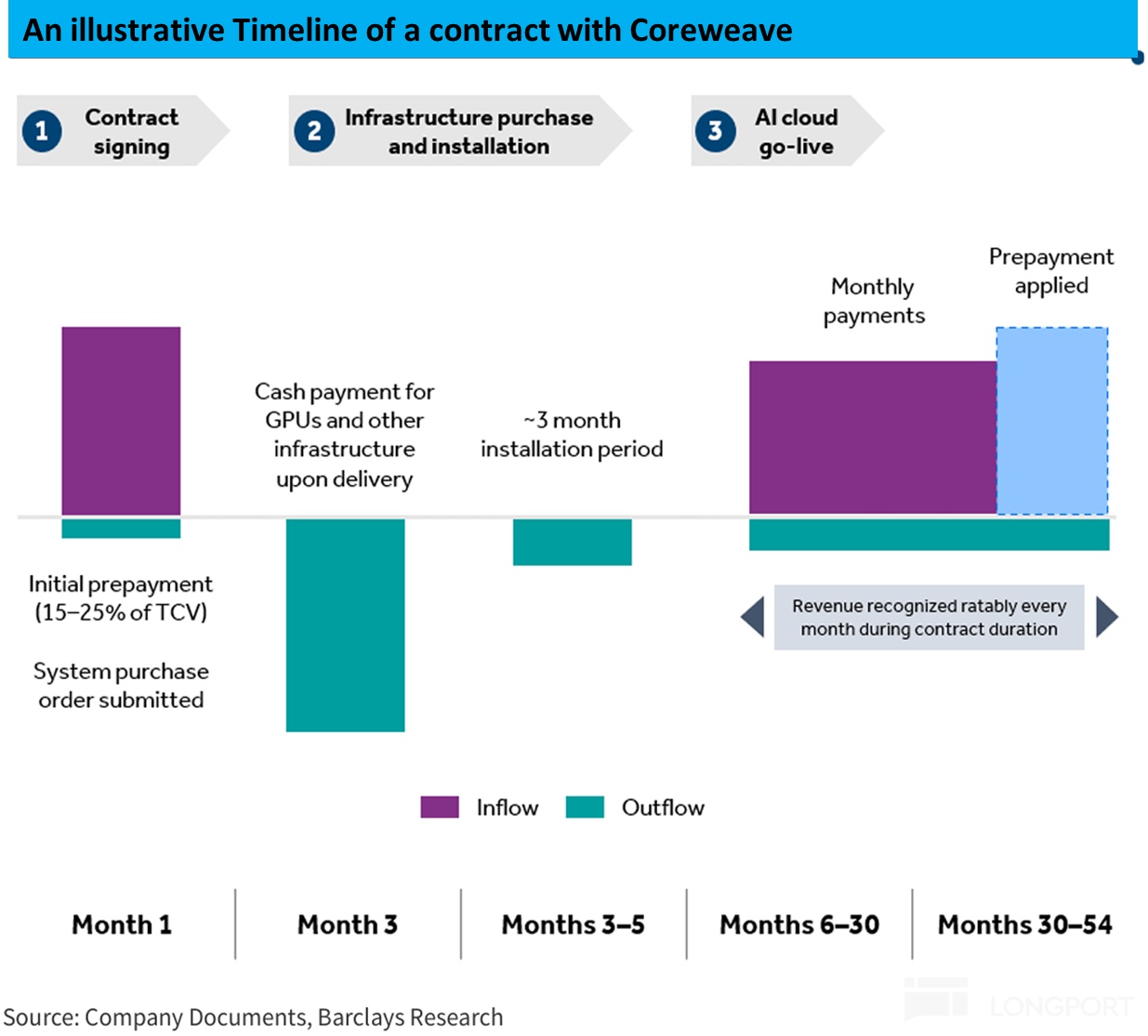 並且,大部分合同在簽訂時,客戶就需要支付合同總額約 15%~25% 的預付款,意味着 CoreWeave 不需要完全以自身資金墊付前期投入。