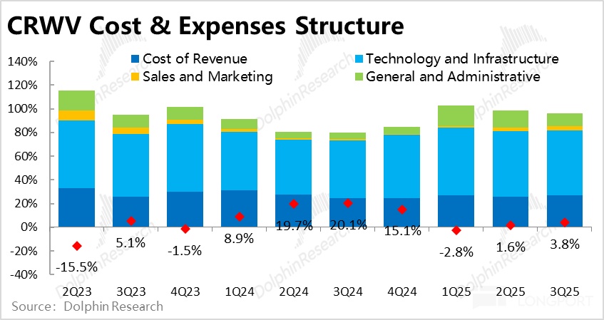 c. 按常規口徑對公司的成本和費用重新劃分,CoreWeave真實成本率 24 財年約 75%(原成本 +T&I 費用扣除其中的 R&D 部分),而傳統三項經營費用(S&M,R&D,G&A)則合計佔收入的 10%~11% 左右。