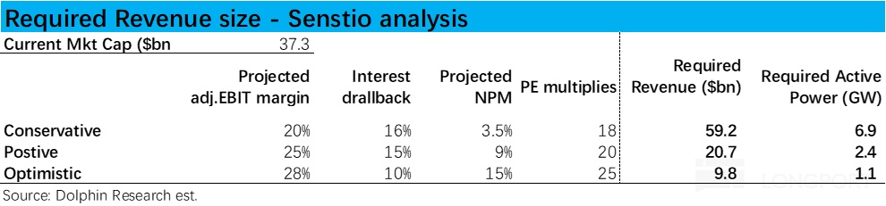 c. 相當樂觀預期:最樂觀預期下,除了上述利好經營利潤率因素落地外,以債券支持 Capex 比重下降,或公司債券融資利率下降這兩個減少利息費用的利好因素也同時發生。假設約 15% 稅後利潤率,則對應收入規模要求約$100 億上下。