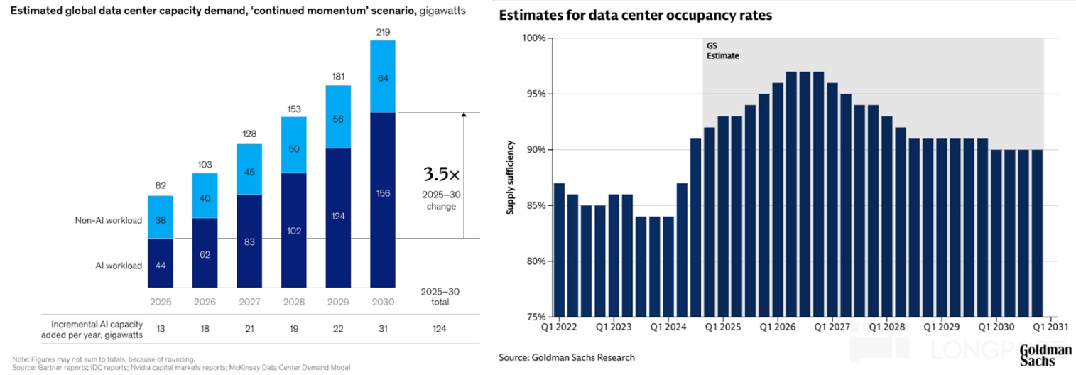 Gartner、IDC 等預期2025~2030 年 5 年間全球對數據中心算力的總需求會增加約 1.7x,其中 AI 算力需求更是會增長 2.5x。而高盛的估算數據中心的平均利用率在 2022~24 年初約爲 85%,在 25~28 年間會有一個明顯的波峯、最高可超 95%