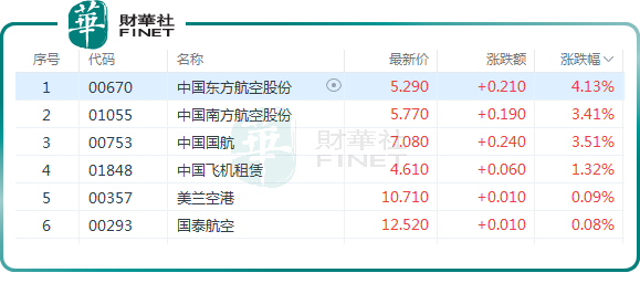12月31日,在「元旦假期」臨近等多重驅動下,港股航空概念股表現活躍。截至發稿前,中國東方航空股份(00670.HK)上漲4.13%,中國國航(00753.HK)漲3.51%,中國南方航空股份(01055.HK)漲3.41%,美蘭空港(00357.HK)、國泰航空(00293.HK)等均漲。